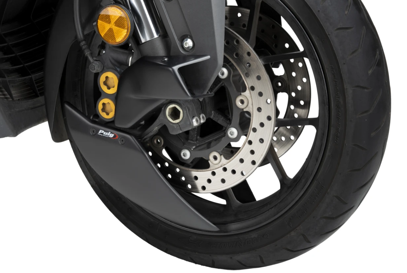 Its studied design, in addition to providing a more sporty and personalized aesthetic, eliminates turbulence at the front wheel by creating a partial lenticular cover that favors the motorcycle's aerodynamics, especially at high speeds. Includes sturdy, lightweight aluminum brackets finished in discreet textured black.
