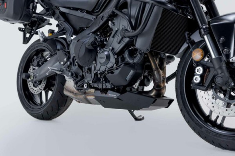 The SW-MOTECH front spoiler, which is tailored to the design of the bike, offers reliable protection against stone chips and unintentional contact with the ground. The powder coating on the surface is extremely durable and permanently protects against corrosion. Extremely sturdy underbody protection can be easily attached to original attachment points using the custom steel attachments provided, all without drilling or welding.