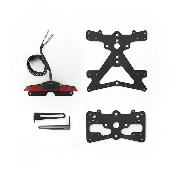 The kit includes a 173x173 mm plate holder, a 166x89.5 mm US plate holder, Rizoma turn signal supports, SMD LED plate light (homologated) and reflector. Warning: to comply the EURO4 Regulation, Rizoma reccomends to purchase the EE400H Side reflector kit.