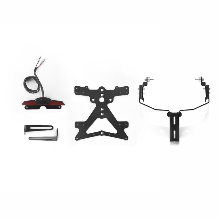 Made from aluminum, each Fox license plate kit is specifically designed for a corresponding motorcycle model. This means it matches the motorcycle styling perfectly and is quick and easy to install. Each kit actually includes everything required to fit it without requiring any modifications to OEM parts. Great functionality plus maximum compactness, but always in complete compliance with legal requirements. Fox kits include an SMD LED license plate light, reflector and Rizoma turn signal supports. They are adjustable and supplied with a safety lock to ensure the correct tilt.