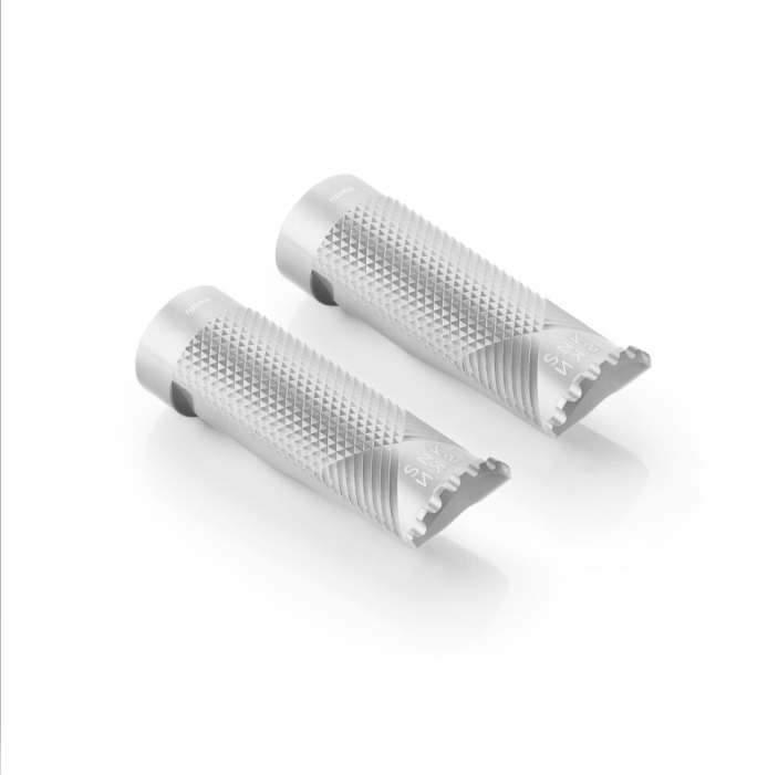 The Rizoma pegs and their mounting kit design takes inspiration by the racing world. So, when mounting, the pegs are not perfectly aligned with the ground, but appear slightly tilted upwards. The upward has been designed to prevent foot traction loss outwards while driving.