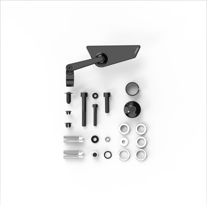 The included Mounting Kit will allow to fit the mirror in 3 configurations: direct clamping on any handlebar with a 22-25.4 mm external diameter; bar end (included) on any handlebar with a 13.5-18 mm inner diameter and minimum 30 mm of free dept space; bar end (included) on any handlebar with M8 and M6 inner tread.