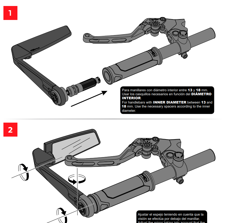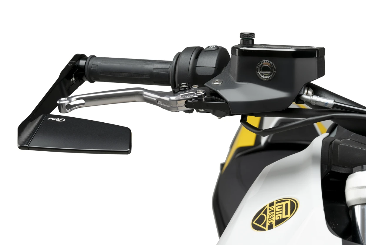 This innovative mirror is easily installed at the end of the handlebar and offers dual functionality: mirror and handguard. Its design allows the mirror to fold, transforming it into an elegant spoiler.