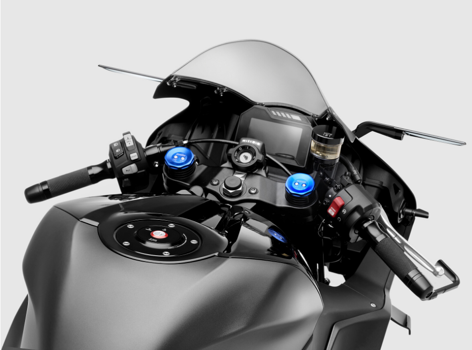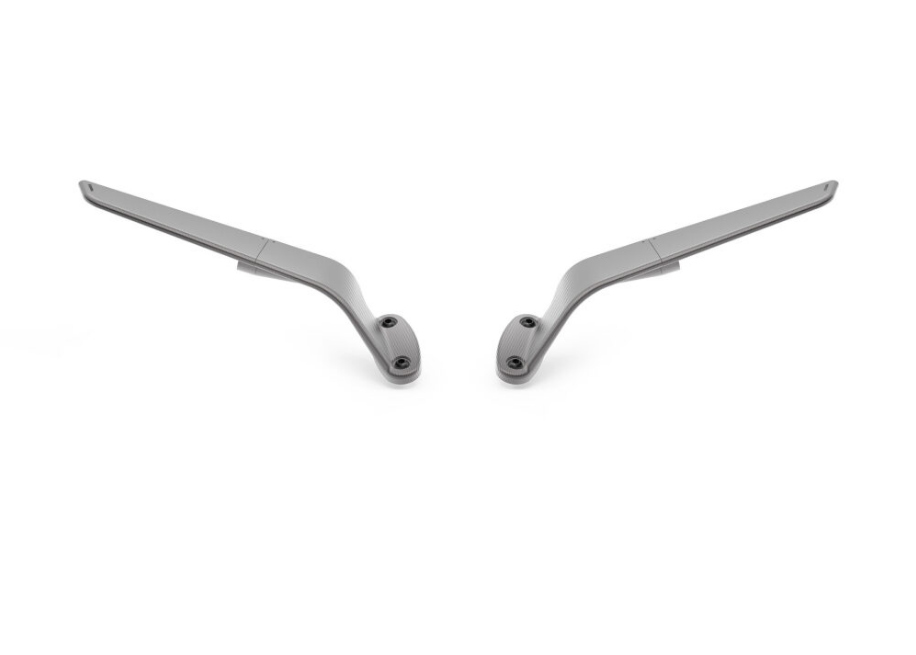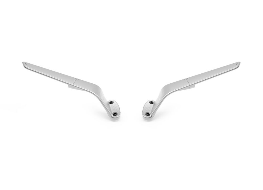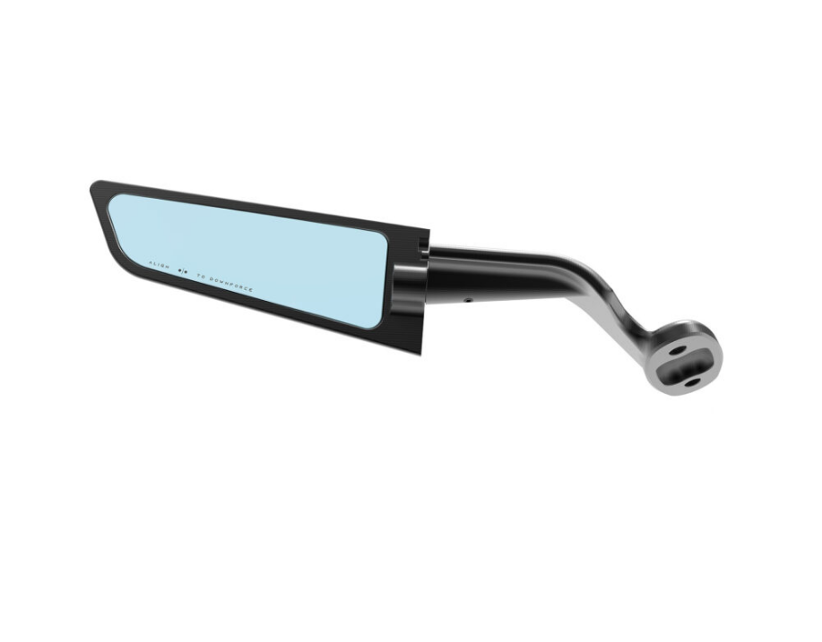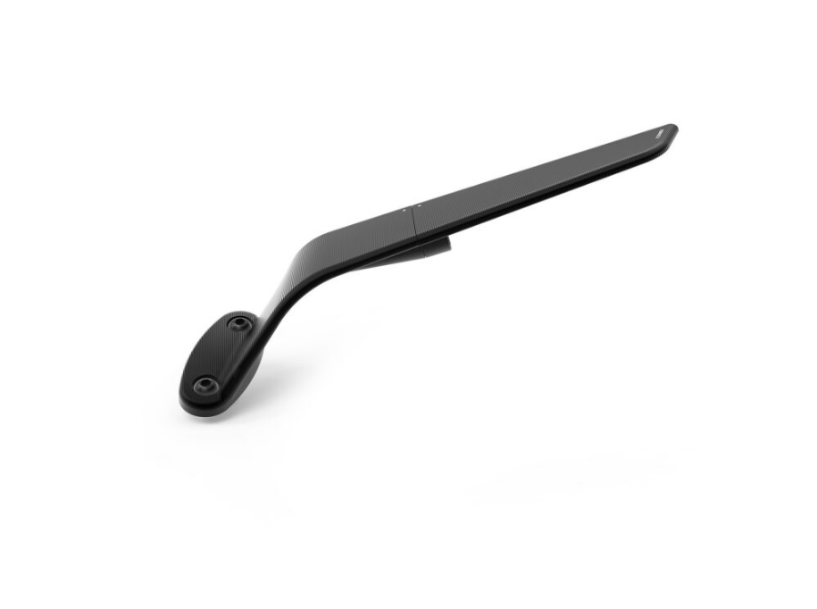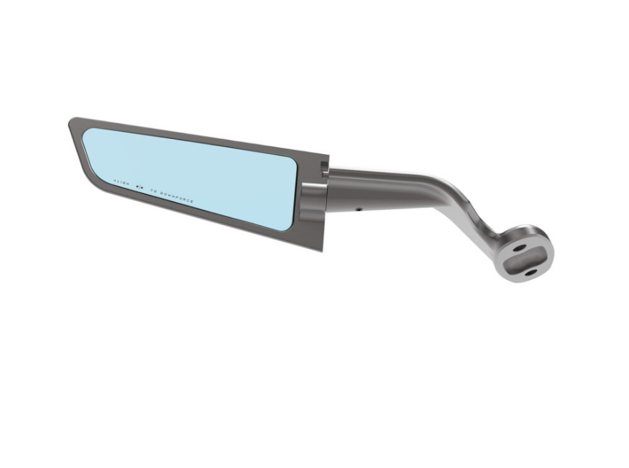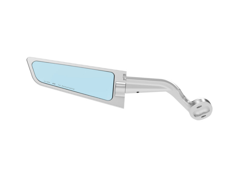 Two elements: a fixed base integrated into the fairing and a movable body that houses the glass. With a single motion, the structure compacts, transforming the mirror into an aerodynamic wing. The result: tangible downforce, up to 4 kg at 300 km/h. Milled from a single block of aluminum and finished with deep anodization, it features a convex HD blue-tinted lens for a sharp, glare-free view.