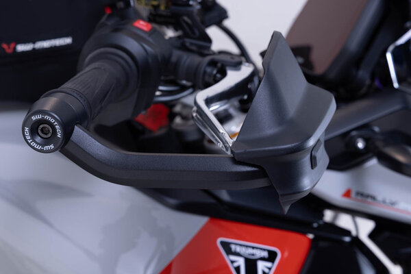 This handguard kit protects your bike's handlebar controls in the event of a fall and your hands from the elements such as cold air and rain. The basis is a sturdy aluminum bracket to which the sports handguard shells are attached. The impact-resistant plastic of the shells is flexible and offers the best protection from external influences. The slim shape and the matt black look also provide a stylish design element on the handlebar. The separately available extension sets provide even more weather protection.