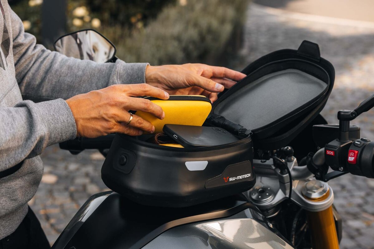 The guide rail of the top ring, which is already attached at the factory, allows easy adjustment of the position of the tank bag on the tank and to the ergonomic needs of the driver. Only the PRO tank bags offer this flexibility. To go with this, SW-MOTECH offers the patented PRO tank rings made of fibreglass reinforced plastic. They are manufactured to match the motorcycle model and attached to the tank filler neck.