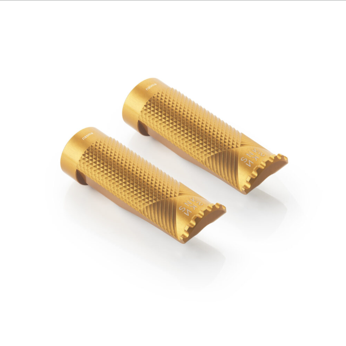 The Rizoma pegs and their mounting kit design takes inspiration by the racing world. So, when mounting, the pegs are not perfectly aligned with the ground, but appear slightly tilted upwards. The upward has been designed to prevent foot traction loss outwards while driving.