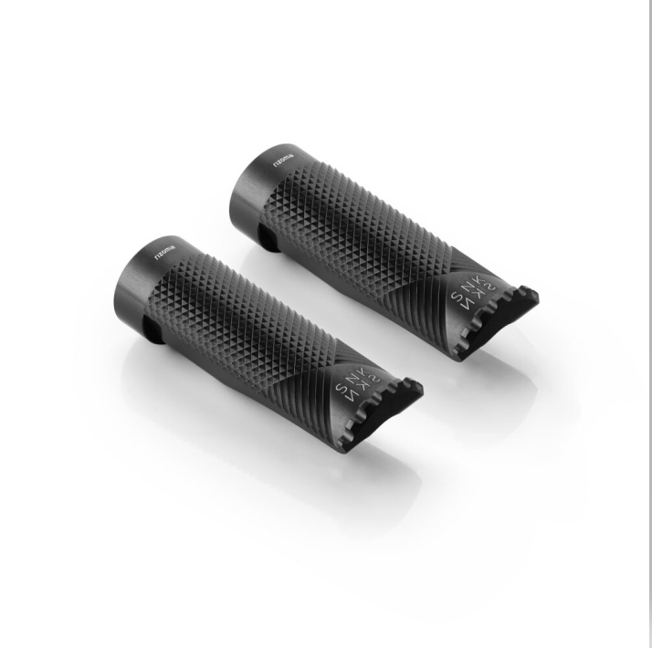 The Rizoma pegs and their mounting kit design takes inspiration by the racing world. So, when mounting, the pegs are not perfectly aligned with the ground, but appear slightly tilted upwards. The upward has been designed to prevent foot traction loss outwards while driving.