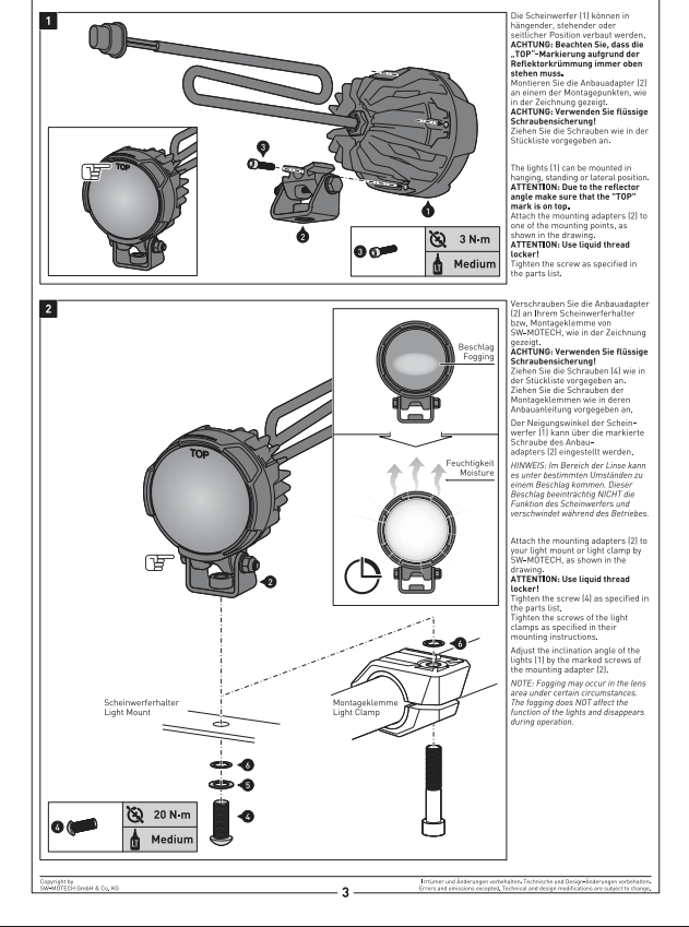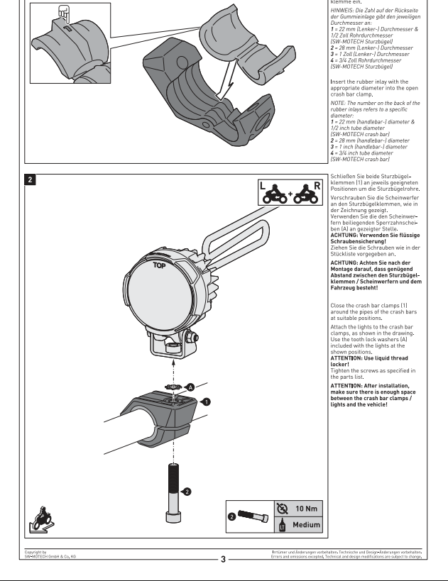 This kit contains all parts required to easily and securely mount the EVO fog lights on the crash bar. The crash bar clamps allow the fog lights to be mounted on crash bars with various pipe diameters.The particularly wide light scatter of the EVO fog lights ensures that you better "see and be seen" in fog or in poor weather. Safety in road traffic is therefore increased. SW-MOTECH sought out a reliable partner for the development of the new EVO fog lights and relied on the expertise of a long-standing top manufacturer from the automotive sector.The focus of the new development was on a compact shape and fulfilling the highest quality standards: the EVO fog lights are water- and dust-tight and protection class IP69. Powerful LEDs provide the best view, while wear-resistant housings ensure long life.