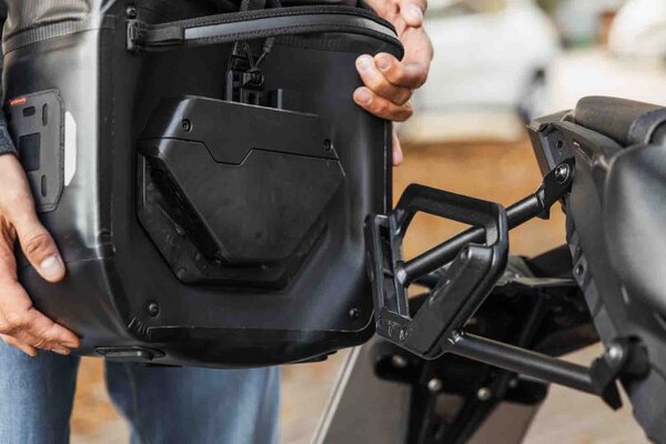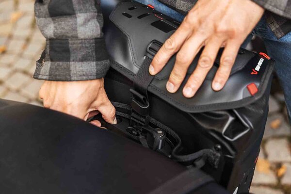 With the new WP Side Bags, specially developed for the innovative V-LOC side carrier with magnetic guide, SW-MOTECH combines uncompromising waterproofing with high everyday practicality and elegant design. The bags combine a sturdy, robust construction with the comfort of soft luggage. The V-LOC mounting system allows for quick and safe installation on the motorcycle. Integrated MOLLE surfaces offer flexible expansion options – ideal for everyday use or extended motorcycle tours.