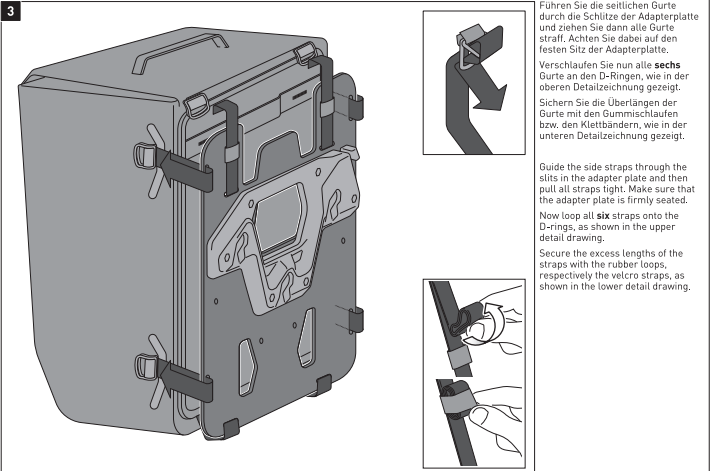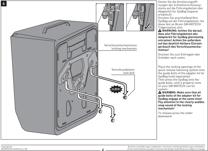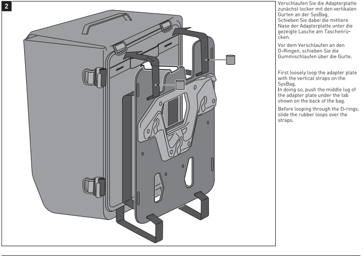 The adapter plates allow you to attach your SysBag WP bag to a side carrier or rack. Before first use, the quick lock system is mounted on the adapter plate.. With integrated straps on the back of the SysBag WP bags the adapter plate is attached to the bag.