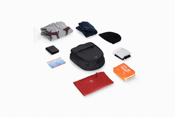 Ideal for small and sporty bikes: The volume of the ION S tail bag can be expanded via zipper from 7 to 15 l and therefore offers enough storage for drinks, a change of clothes, and other necessities for day trips and short rides. The compact bag can be lashed onto riveted D-rings with the included loop straps. Two straps with hook-and-loop closure, along with a slot on the underside, enable fast and secure attachment to a seat or rack. Reinforced sides, a padded lid and cinch straps guarantee a stable, secure fit even when you're riding at speed.Things stowed in the outer pocket or mesh compartment in the inside of the lid are particularly close at hand. A carrying handle makes the ION tail bag a practical travel companion even away from the street.