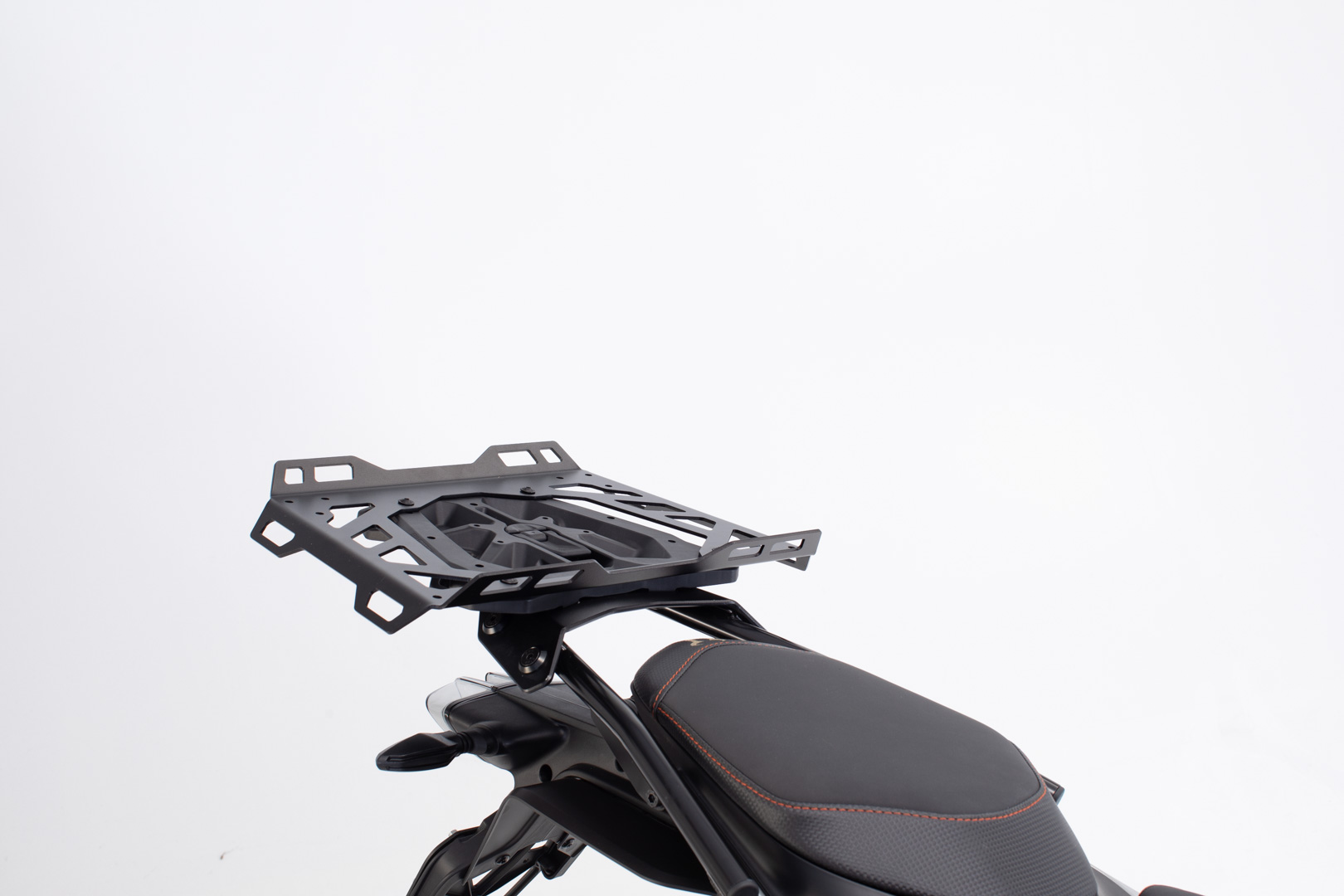Secure transportation of wide bags and luggage rolls: the stable extension almost doubles the size of the STREET-RACK adapter plate contact surface. The many tie-down points and the raised elements in the front and back of the expansion are perfect for securely mounting bulky luggage. A black powder coating protects the aluminum construction from corrosion and gives it an appealing look.No tools are required for attaching the adapter plate to the STREET-RACK. The adapter plate is simply slid onto the rack and securely locked using the rotating cam latch. After your ride, the adapter plate can be removed in seconds and just the rack stays on the motorcycle.