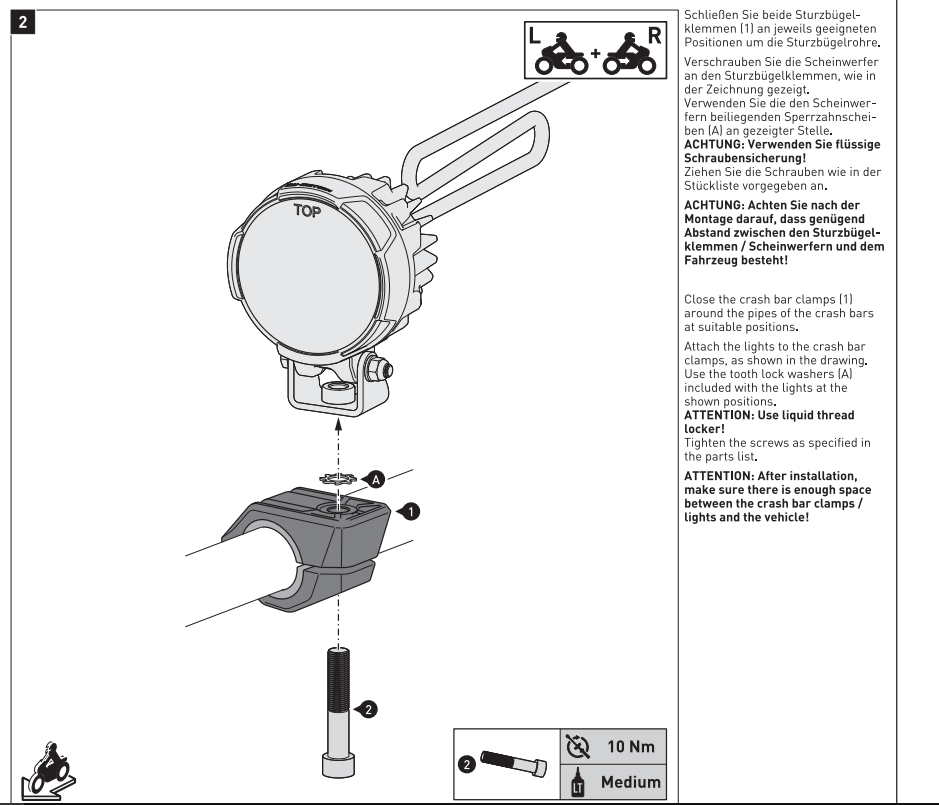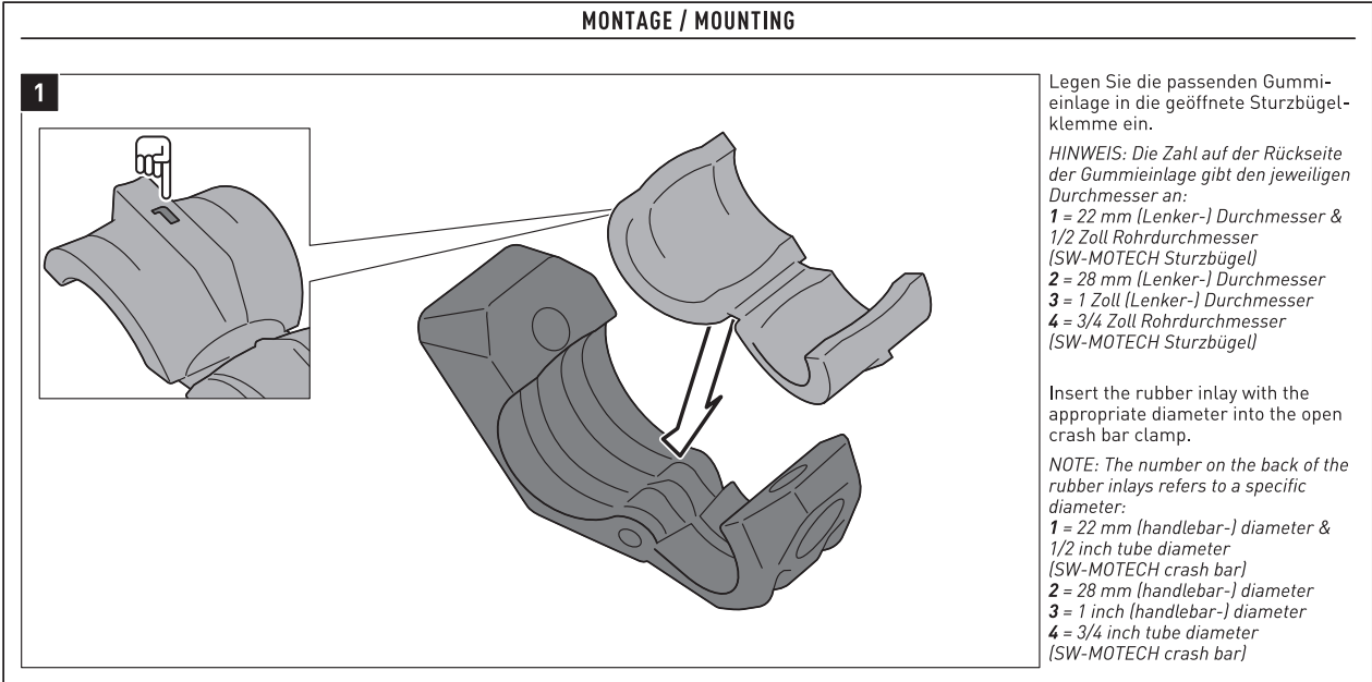 With these clamps, EVO lights can be mounted to crash bars or other bike parts with the appropriate pipe diameter. Rubber inserts for adapting to 22/25.4/26/27 mm and 28 mm are included in delivery.