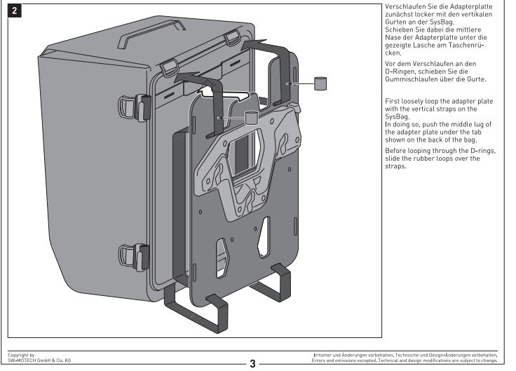 The adapter plates allow you to attach your SysBag WP bag to a side carrier or rack. Before first use, the quick lock system is mounted on the adapter plate.. With integrated straps on the back of the SysBag WP bags the adapter plate is attached to the bag.