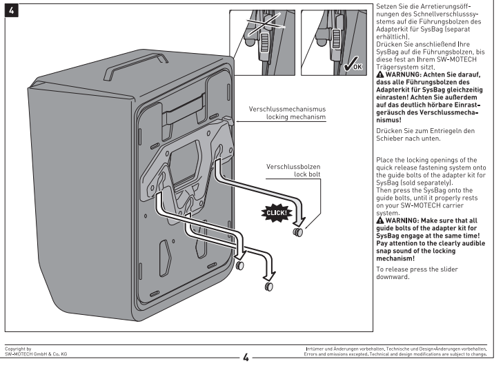 Quick lock system of the adapter plate guarantees a secure hold of the SysBag WP on the side carrier