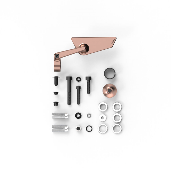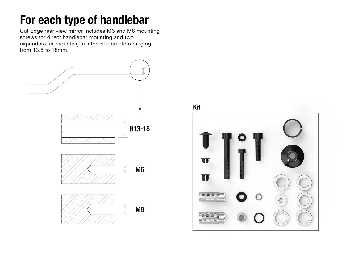 The included Mounting Kit will allow to fit the mirror in 3 configurations: direct clamping on any handlebar with a 22-25.4 mm external diameter; bar end (included) on any handlebar with a 13.5-18 mm inner diameter and minimum 30 mm of free dept space; bar end (included) on any handlebar with M8 and M6 inner tread.